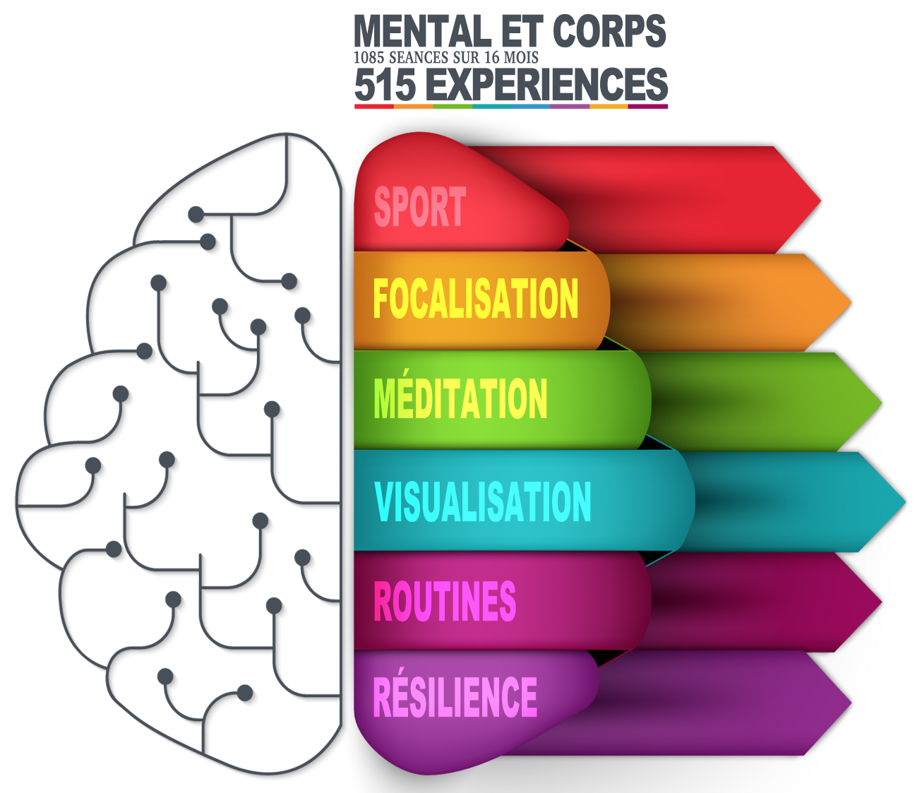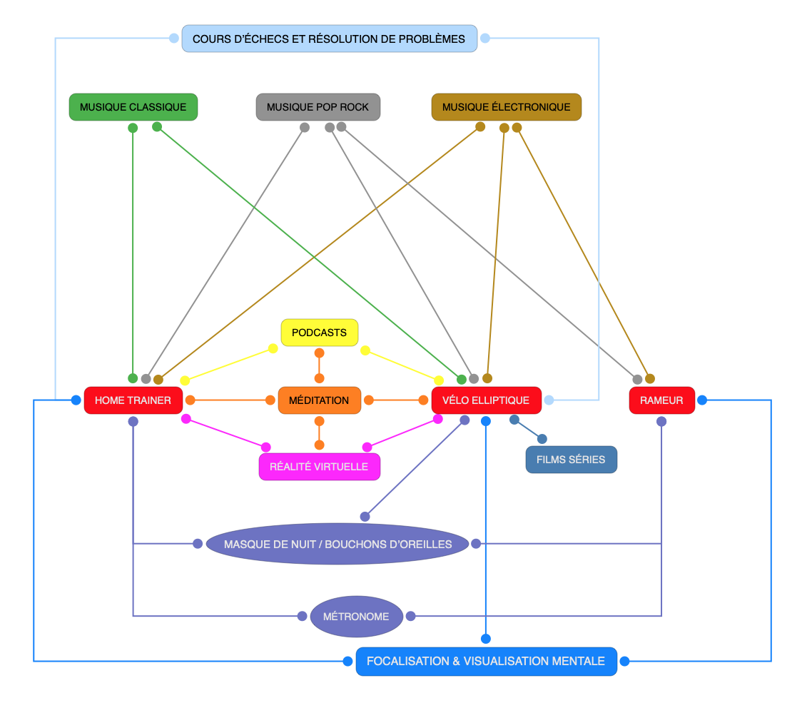 1. Mettre en œuvre plusieurs routines quotidiennes sur une durée de 16 mois. Les 3 heures de sport par jour étaient planifiées avec des séances de focalisation, de méditation active et de visualisation mentale auxquelles j'associais la musique (classique, rock, électro), l'écoute de tempi réguliers et des rythmes simples ou élaborés, l'écoute active de podcasts (mémorisation), la résolution de problèmes (jeu d'échecs) et la réalité virtuelle (avec ou sans casque).