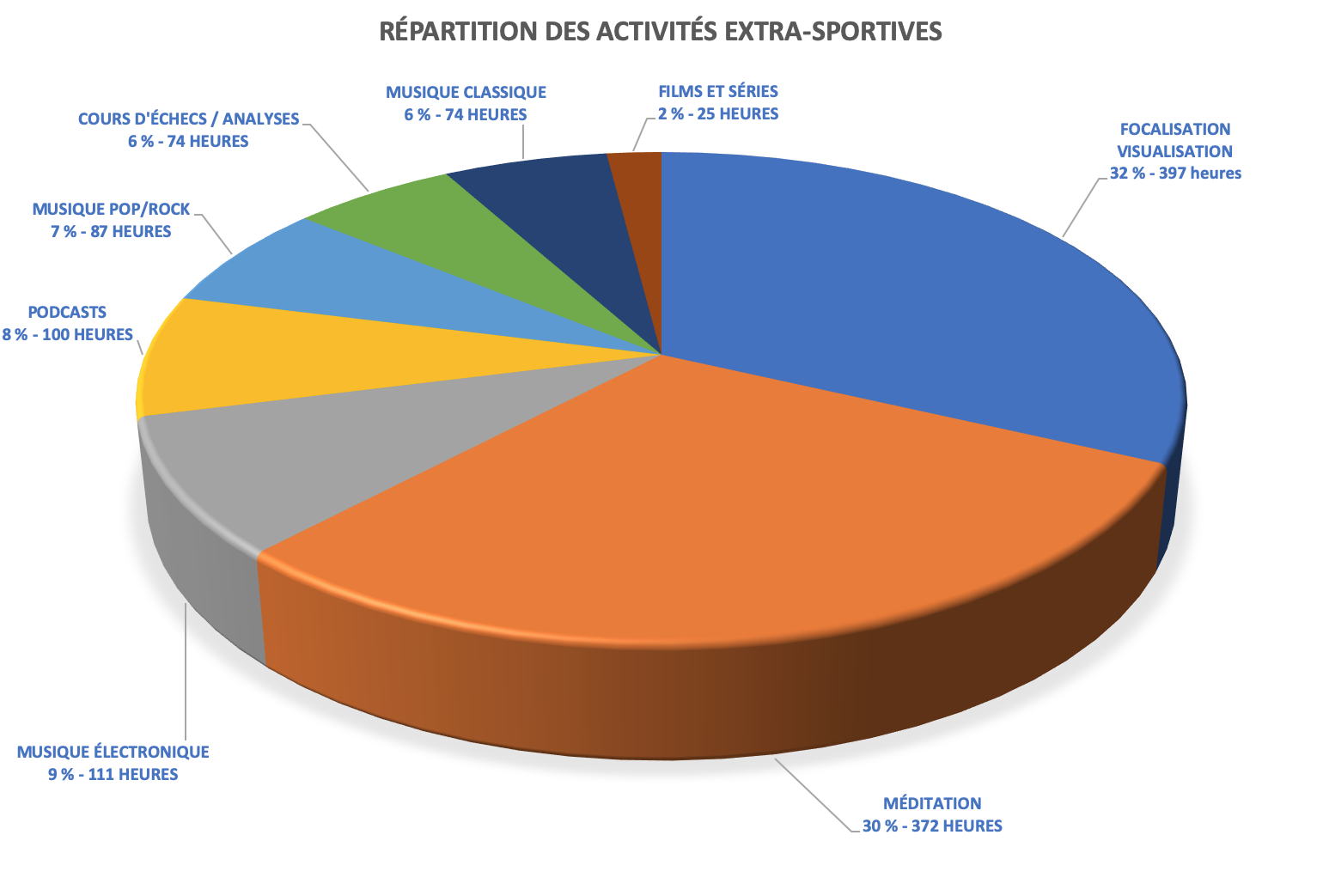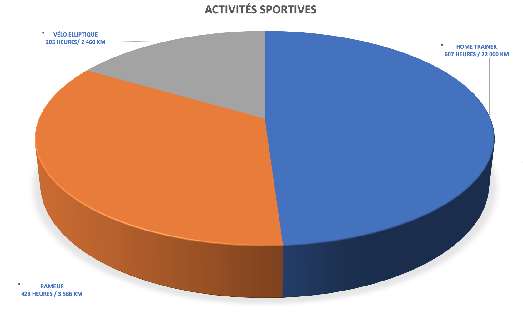 - 607 heures de cyclisme sur home trainer (49 % du temps global) – 22 000 kilomètres